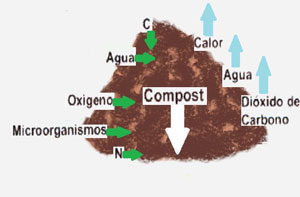 En el esquema se puede observar como nosotros aportamos carbono (material seco), nitrógeno (material verde), agua, oxígeno y los microorganismos que van apareciendo (suplementariamente se puede añadir un preparado que los incorpora para acelerar el proceso), todo ello emite hacia el exterior calor, agua que se evapora y dióxido de carbono CO2. Por fin nosotros extraemos el compost. |