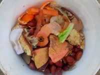 Los restos de comida, excluidos los fritos, huesos, caldos, carnes ó pescados por el contenido de aceites que contienen los podemos añadir. (Básicamente todas las cáscaras de frutos secos, frutas, verduras, papel no tintado ya que contiene plomo el de color, poso del café, cáscaras de huevos.)